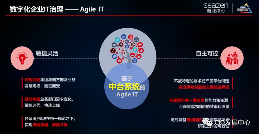 为支持企业数字化转型,企业必须建立与之相匹配的新型企业IT治理架构,建立基于中台系统的Agile IT系统,满足“敏捷灵活、自主可控”。一方面不要全面排斥系统的碎片化,碎片化的系统反而可能会给用户带来使用上的灵活和便捷;但另一方面必须在统一的中台框架下实施。