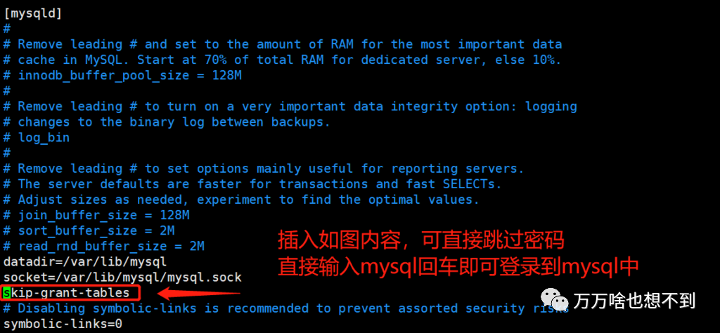 修改/etc/my.cnf文件,在如图位置添加skip-grant-tables