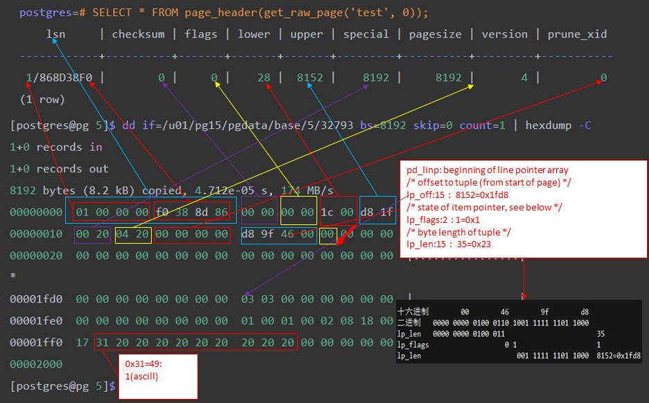 [postgres@pg 5]$ dd if=/u01/pg15/pgdata/base/5/32793 bs=8192 skip=0 count=1 | hexdump -C