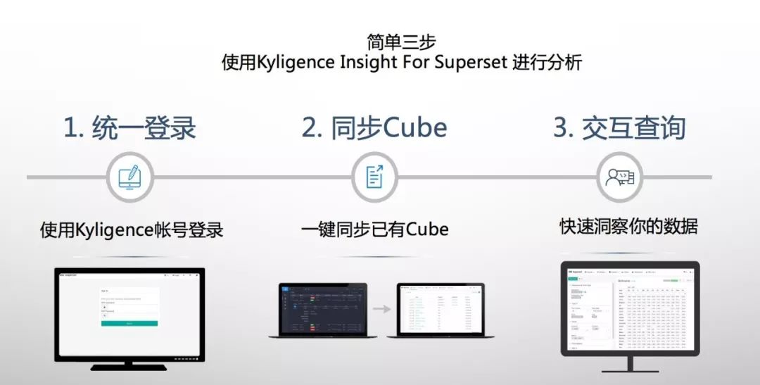 "Superset" 与 Kyligence/ Kylin 实现无缝对接,直接通过 Kyligence/Kylin 账号登录,一键同步cube并在 "Superset"上进行数据探索及可视化,省去反复建模的重复工作,尽享极速,高效的大数据分析体验。