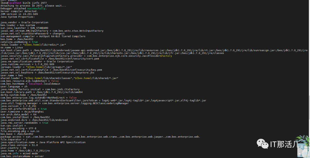 通过Java进程对应的pid,使用jinfo查看jvm各种配置信息。比如jdk版本,环境,路径,虚拟机名称,编码,堆栈等信息。