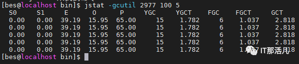 jstat工具以命令行的方式,允许以固定的监控频次输出 JVM 的各种监控指标,比如使用 -gcutil 输出 GC 和内存占用汇总信息,每隔 5 秒输出一次,输出 100 次.