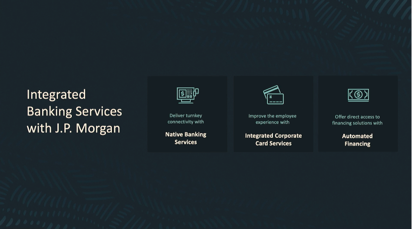 通过集成的 J.P.Morgan 旅行卡和费用服务,Oracle Fusion ERP 云解决方案用户可以做到员工报销完全自动化。通过自动化金融服务解决方案,Oracle Fusion ERP 云解决方案用户可以快速向摩根银行申请投融资服务。