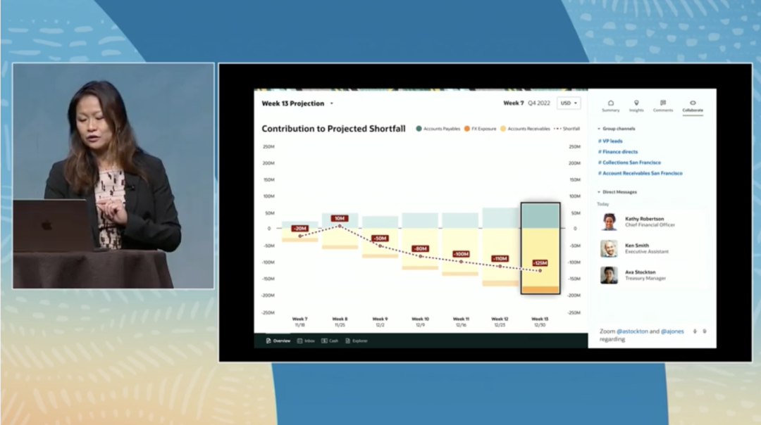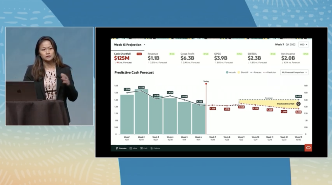 在现场,甲骨文企业资源计划管理云应用开发副总裁 Catherine You 还进行了一场生动有趣的场景演示。模拟成一家全球制造公司 FP&A Director(财务计划分析总监)的她收到了系统预警,因为Oracle 资金预测模型发现未来几周公司可能会有一个1.25亿美元的资金缺口。