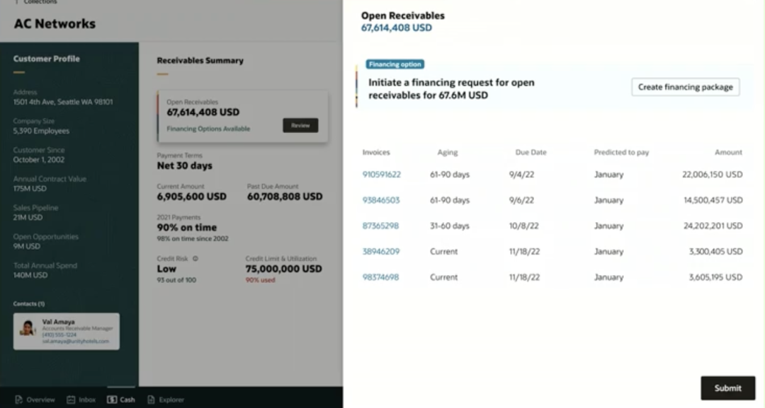 为解决几个星期后的资金缺口,系统还推荐她和司库经理将一些应收账款打包向金融服务提供商申请提前融资。而司库经理可以在 Oracle Fusion ERP 云解决方案中直接打包申请该金融服务,信息可直接用于金融服务申请。