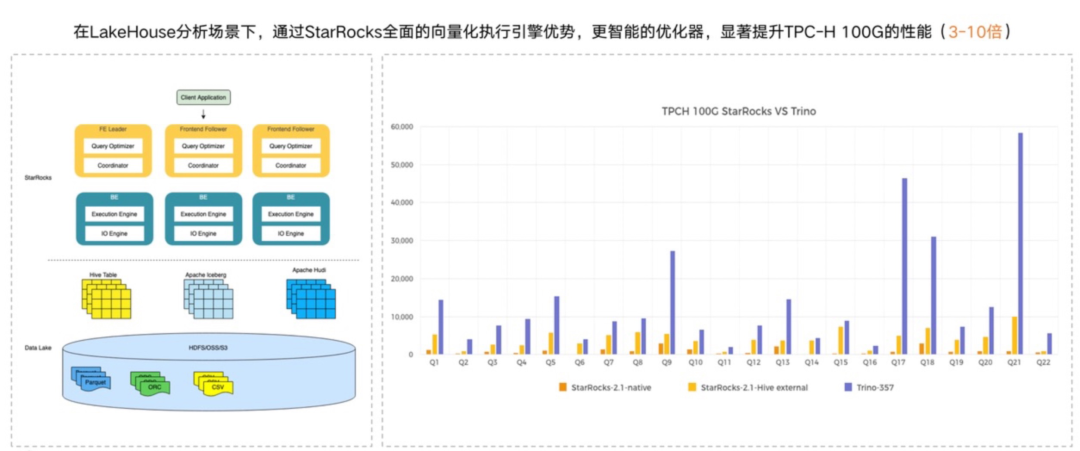 作为阿里云在数据湖 3.0 云原生化、弹性化、实时化的重要产品,StarRocks 拥有远超同类产品的分析性能,精简的 MPP 架构、高效的向量化引擎以及全新设计的基于成本的优化器,在 Lakehouse 分析场景下,显著提升了 TPC-H 100G 的性能。和业界开源的 Trino 相比,StarRocks 2.1 的 Hive external 查询速度有 1.7-2.2 倍的提升。
