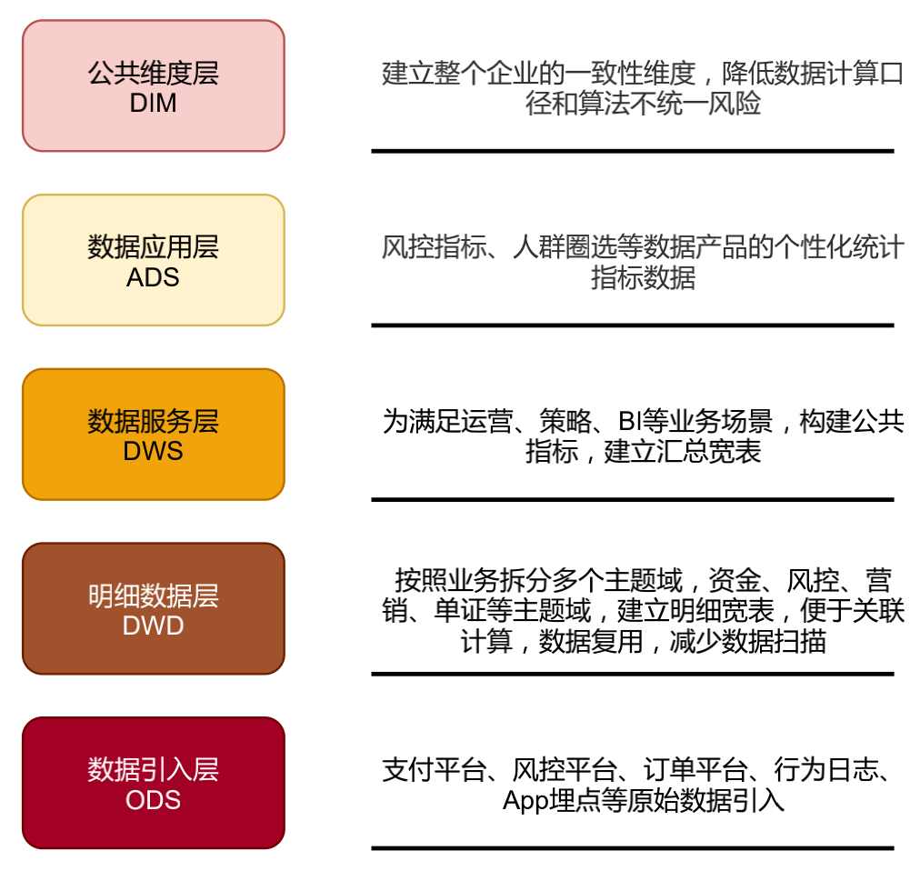 在数据仓库的维度建模中,XTransfer 选择了星型模型,使用分层设计方案来建设实时数仓,分层架构如下图所示: