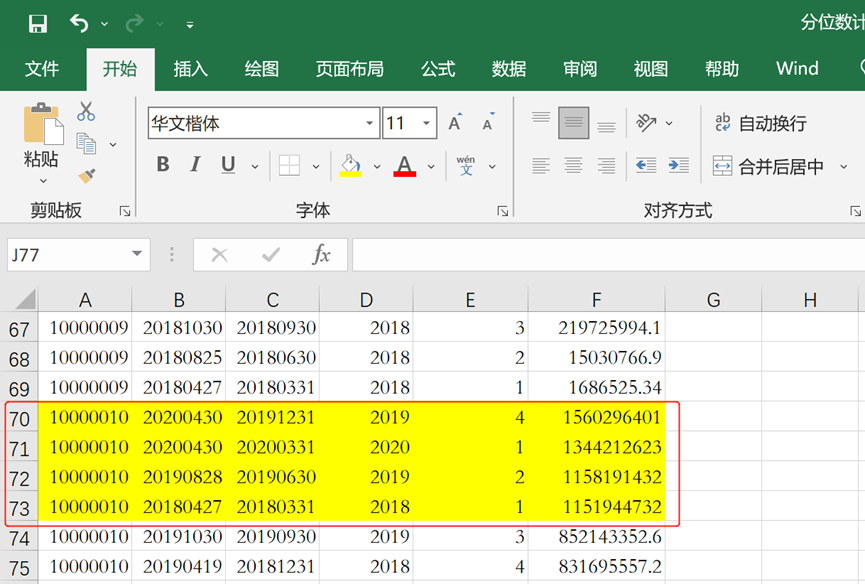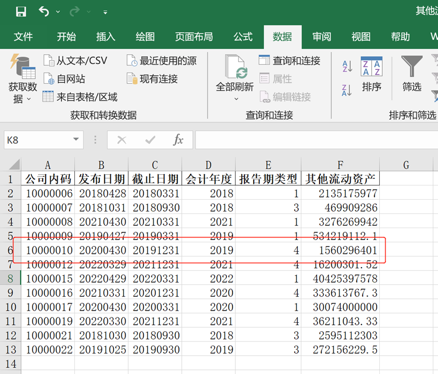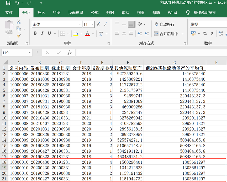 🙋检验输出结果,原表中公司代码10000010有17条数据,前20%的数据就有3.4条,向下取整应该是4条数据。将其他流动资产按照降序排序,前四条数据中的其他流动资产分别为1560296401、1344212623、1158191432、1151944732,输出结果与上述的4条数据一致。