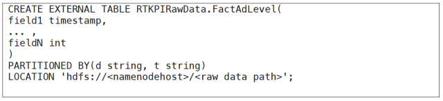 与此同时,你的客户端应用依然可以像平常一样在HDFS 中存储数据。你需要做的就是像下面那样在Hive 中创建一个外部表,指定本地HDFS 中的路径作为数据源。