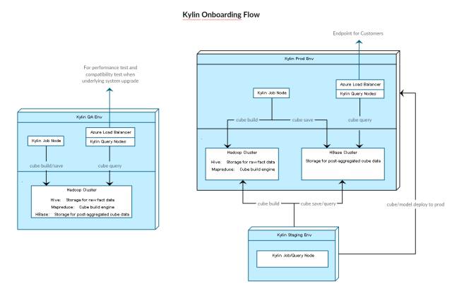 Staging 环境和Prod 环境共享相同的底层系统(Hive/HBase)。所以我们可以先在Staging 环境中设计、审查和构建新的Cube,当一切顺利后,再把新Cube 上线到Prod环境中。
