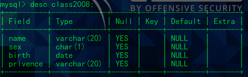 mysql> desc user10;+-------+-------------+------+-----+---------+-------+| Field | Type | Null | Key | Default | Extra |+-------+-------------+------+-----+---------+-------+| id | int | YES | | NULL | || name | varchar(20) | YES | | NULL | || age | int | YES | | 10 | |+-------+-------------+------+-----+---------+-------+3 rows in set (0.05 sec)