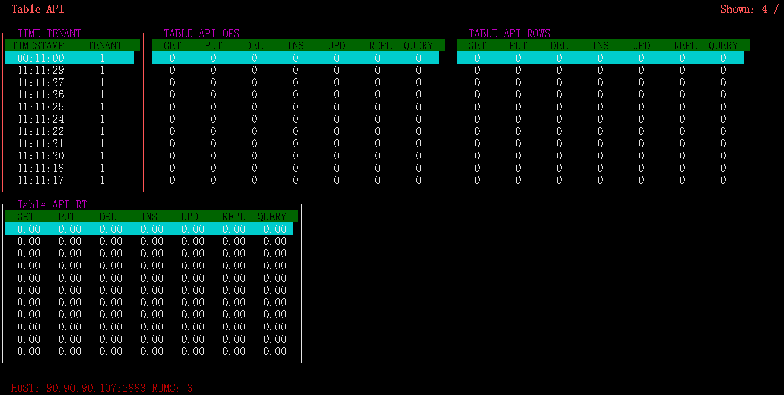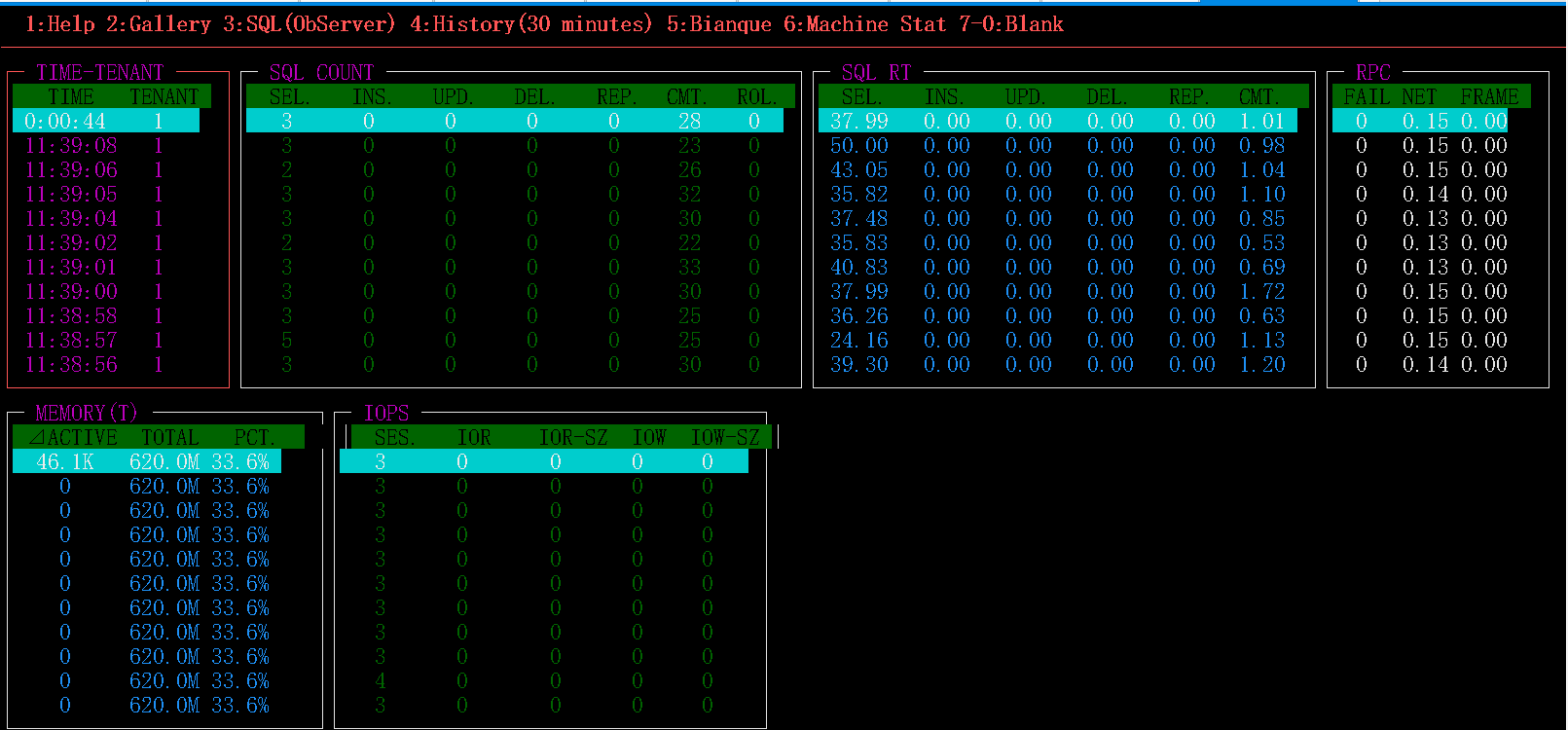 DOOBA 的原理是使用 MySQL 命令连接到 OceanBase 的 SYS 租户中,实时展示租户 SQL 的 QPS(包括 select、update、insert、delete、commit)以及相应 SQL 的平均延时(RT)。同时还可以展示各个节点的 SQL 的 QPS 以及 RT 等。