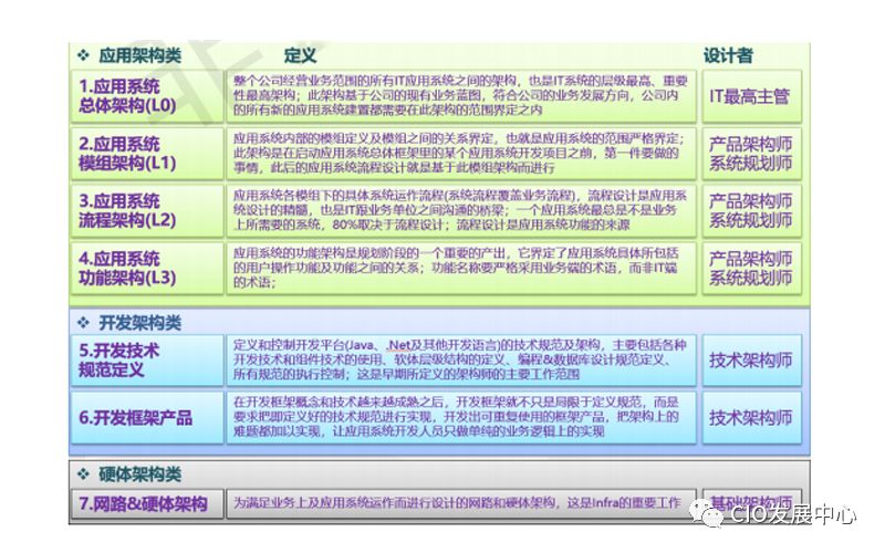 IT 架构设计能力:架构是个通用的名字,IT 相关架构包含很多,我用自己的纬度对IT相关常用的几类架构进行分类和定义(如图:IT 常见架构分类与定义)。尤其企业的应用系统总体架构设计,也就是 IT 系统顶层架构设计,是 CIO 的头等大事,是 CIO的核心职责,是需要完全匹配和服务企业的业务蓝图的。