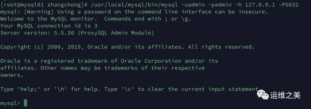 ProxySQL 默认管理端口 6032,默认需要 127.0.0.1 来进入,进入方式和连接MySQL 方式一致: