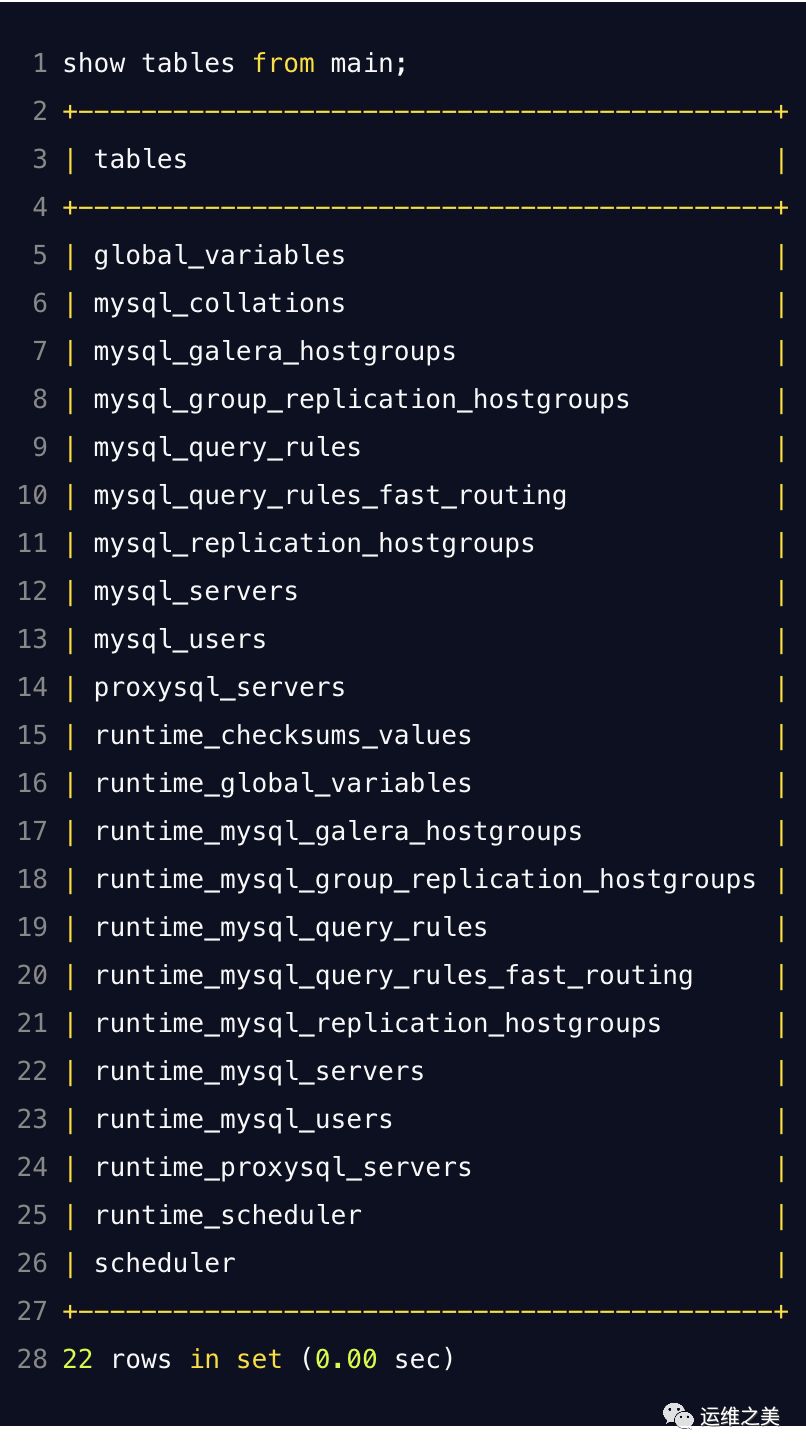 mysql> show tables;+-------------------+| tables |+-------------------+| mysql_servers || mysql_users || mysql_query_rules || global_variables || mysql_collations || debug_levels |+-------------------+