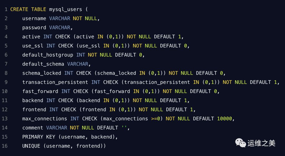 mysql_users - 连接到 ProxySQL 的用户及其凭据列表。请注意,ProxySQL 也将使用相同的凭据连接到后端服务器!