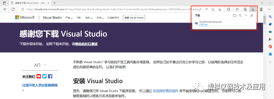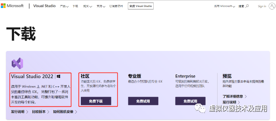 (1)在浏览器中输入下载地址“https://visualstudio.microsoft.com/zh-hans/downloads/”打开下载页面,此时的Visual Studio版本为Visual Studio 2022,在打开的页面中选择适合Windows操作系统的社区版,点击“免费下载”按钮开始下载;