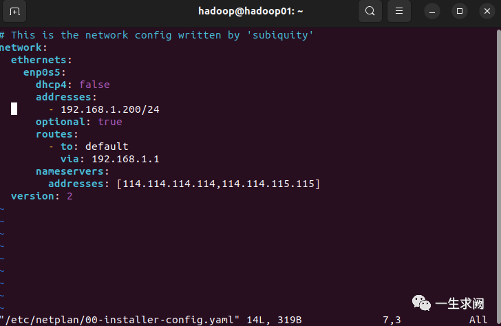 hadoop@hadoop01:~$ sudo vim /etc/netplan/00-installer-config.yaml