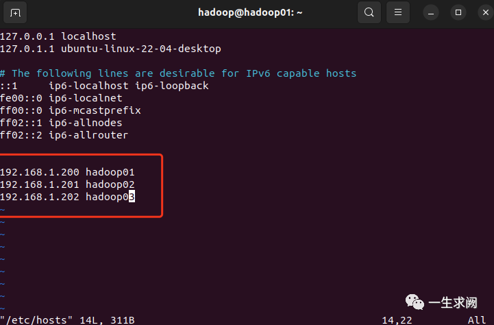 hadoop@hadoop01:~$ sudo vim /etc/hosts#进入hosts文件中将三台虚拟机ip和主机名映射关系写上去