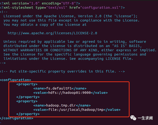 hadoop@hadoop01:/usr/local/hadoop/etc/hadoop$ sudo vim core-site.xml在文件里添加以下内容:<--!配置namenode位置--><property><name>fs.defaultFS</name><value>hdfs://hadoop01:9000</value></property><--!配置hadoop运行时文件存储的位置--><property><name>hadoop.tmp.dir</name><value>file:/usr/local/hadoop/tmp</value></property>