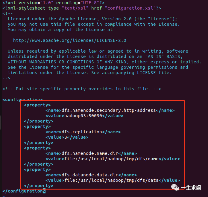 hadoop@hadoop01:/usr/local/hadoop/etc/hadoop$ sudo vim hdfs-site.xml在文件里添加如下内容:<!--指定sencodarynamenode地址--><property><name>dfs.namenode.secondary.http-address</name><value>hadoop03:50090</value></property><!--指定hdfs保存的副本数量--><property><name>dfs.replication</name><value>3</value></property><!--其中/usr/local/hadoop/tmp这个路径是core-site里面设定的数据保存路径--><property><name>dfs.namenode.name.dir</name><value>file:/usr/local/hadoop/tmp/dfs/name</value></property><property><name>dfs.datanode.data.dir</name><value>file:/usr/local/hadoop/tmp/dfs/data</value></property>