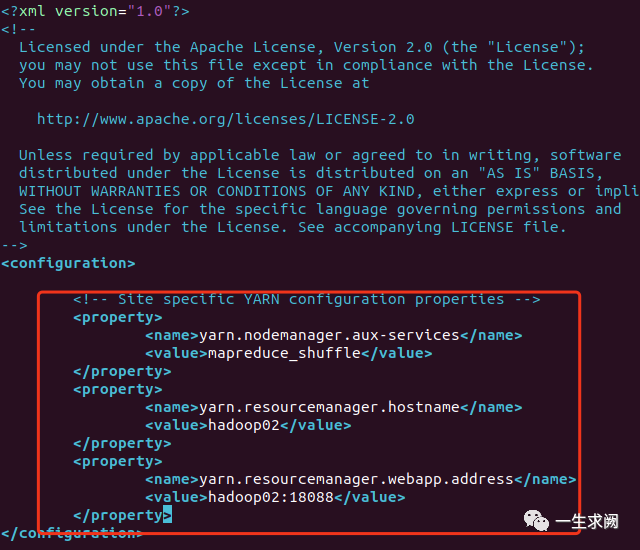 hadoop@hadoop01:/usr/local/hadoop/etc/hadoop$ sudo vim yarn-site.xml在文件里添加如下内容:<!--获取数据方式为shuffle--><property><name>yarn.nodemanager.aux-services</name><value>mapreduce_shuffle</value></property><!--指定resourcemanager的位置--><property><name>yarn.resourcemanager.hostname</name><value>hadoop02</value></property><!--指定resourcemanager对web页面曝光的访问地址--><property><name>yarn.resourcemanager.webapp.address</name><value>hadoop02:18088</value></property>