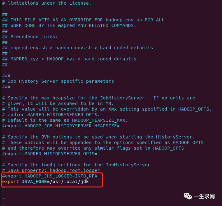hadoop@hadoop01:/usr/local/hadoop/etc/hadoop$ sudo vim mapred-env.sh在文件里添加如下内容:export JAVA_HOME=/usr/local/jdk