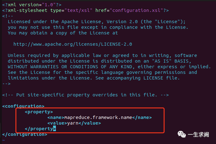 hadoop@hadoop01:/usr/local/hadoop/etc/hadoop$ sudo vim mapred-site.xml在文件里添加如下内容:<!--指定mapreduce运行在yarn上--><property><name>mapreduce.framework.name</name><value>yarn</value></property>