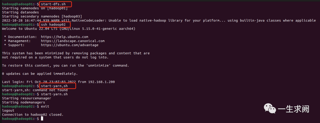 在hadoop01上:start-dfs.sh在hadoop02上:start-yarn.sh