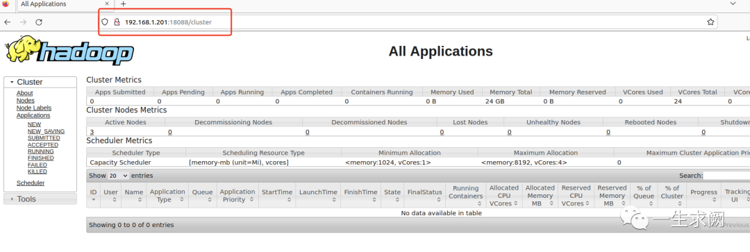http://192.168.1.201:18088 #因为将resourcemanager配置在了hadoop02上,且指定了固定端口