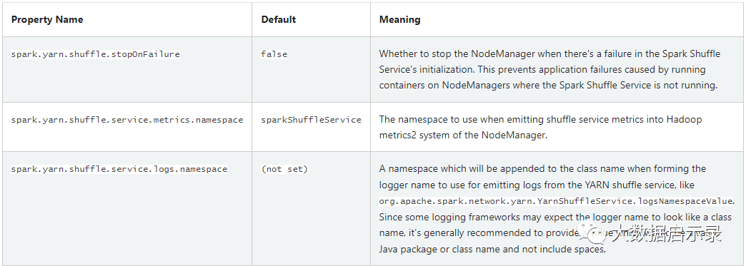 在“spark-defaults.conf”中必须添加如下配置项:spark.shuffle.service.enabled truespark.shuffle.service.port 7337说明1.如果1.如果“yarn.nodemanager.aux-services”配置项已存在,则在value中添加 “spark_shuffle”,且用逗号和其他值分开。2.“spark.shuffle.service.port”的值需要和上面“yarn-site.xml”中的值一样。配置参数描述spark.shuffle.ser vice.enabled :NodeManager中一个长期运行的辅助服务,用于提升Shuffle 计算性能。默认为false,表示不启用该功能。spark.shuffle.ser vice.port :Shuffle服务监听数据获取请求的端口。可选配置,默认值 为“7337”。