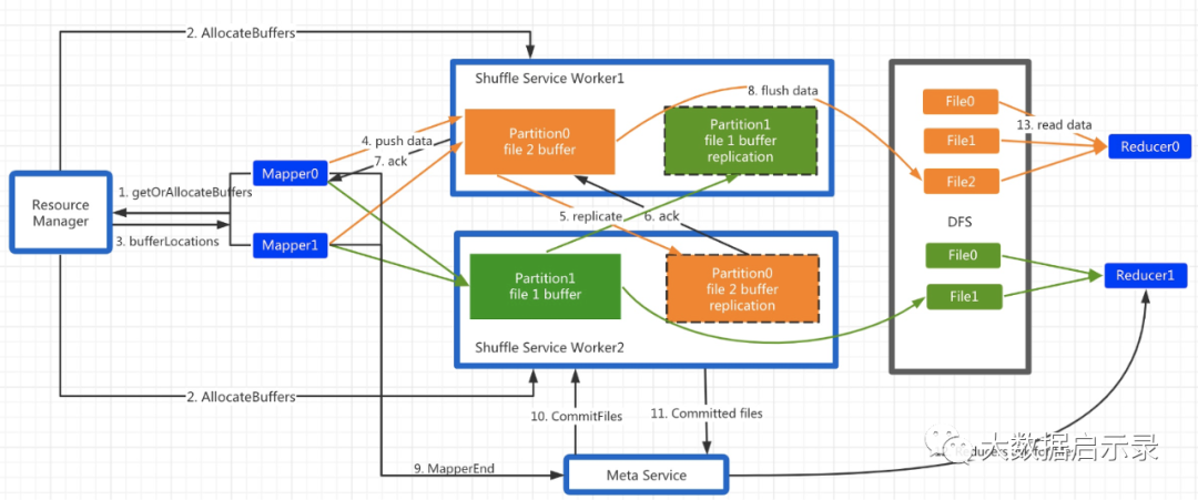RSS采用Push Style的shuffle模式,每个Mapper持有一个按Partition分界的缓存区,Shuffle数据首先写入缓存区,每当某个Partition的缓存满了即触发PushData。