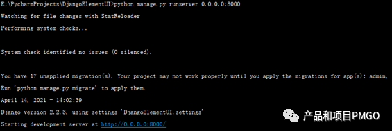 在浏览器输入你服务器的 ip(这里我们输入本机 IP 地址: 127.0.0.1:8000) 及端口号,如果正常启动,输出结果如下: