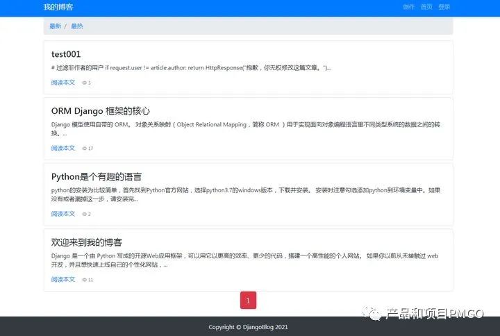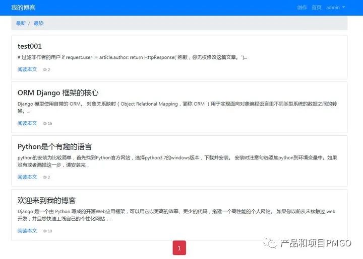 展示所有的博文列表并实现列表的分页功能,点击阅读链接可以查看文章详情,另外我们增加浏览量显示功能用于进行简单的数据统计。
