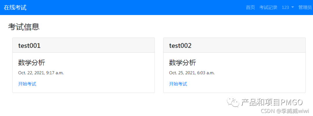 <!-- extends表明此页面继承自 base.html 文件 -->{% extends "base.html" %}{% load static %}<!-- 写入 base.html 中定义的 title -->{% block title %}在线考试系统{% endblock title %}<!-- 写入 base.html 中定义的 content -->{% block content %}<div class="container"><div class="container"><br><h3>考试信息</h3><div class="container"><div class="row mt-4">{% for paper1 in paper %}<!-- 文章内容 --><div class="col-6 mb-6"><!-- 卡片容器 --><div class="card"><!-- 标题 --><h4 class="card-header">{{ paper1.title }}</h4><!-- 摘要 --><div class="card-body"><h4 class="card-title">{{ paper1.course }}</h4><p class="card-text">{{ paper1.examtime }}</p><a href="/startExam/?sid={{ student.sid }}&title={{ paper1.title }}&subject={{ paper1.course }}" class="card-link">开始考试</a></div></div></div>{% endfor %}</div></div><p></p></div></div>{% endblock content %}