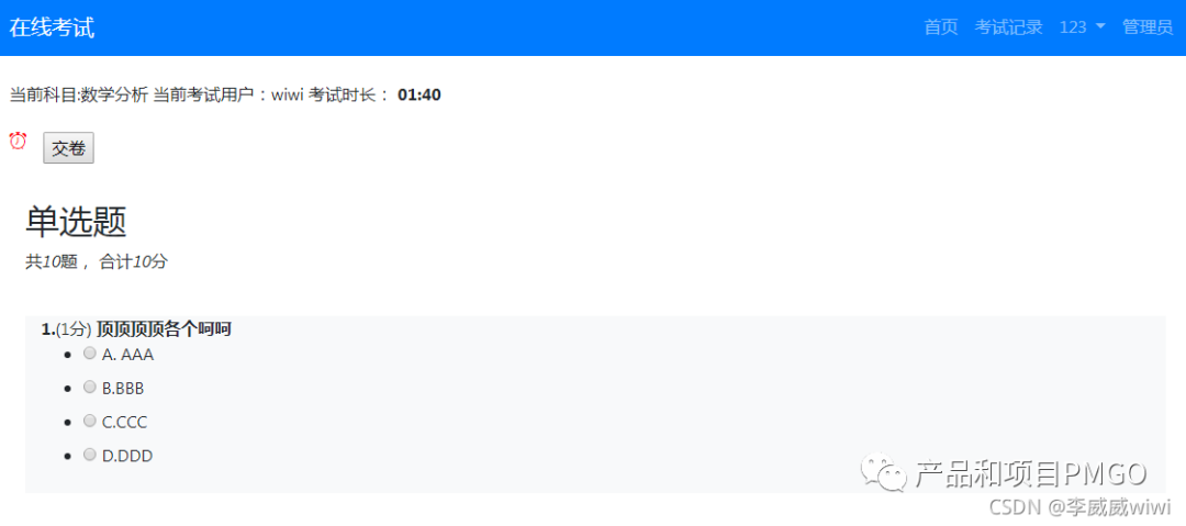 # 考试信息def startExam(request):sid =request.GET.get('sid')title =request.GET.get('title') # 试卷名字 唯一subject1 =request.GET.get('subject') # 考试科目# 获取学生信息student =models.Student.objects.get(sid=sid)# 试卷信息paper =models.TestPaper.objects.filter(title=title,course__course_name=subject1)context = {'student':student,'paper':paper,'title': title,'subject':subject1,'count':paper.count() # 数据表中数据的条数}returnrender(request, 'exam.html', context=context)