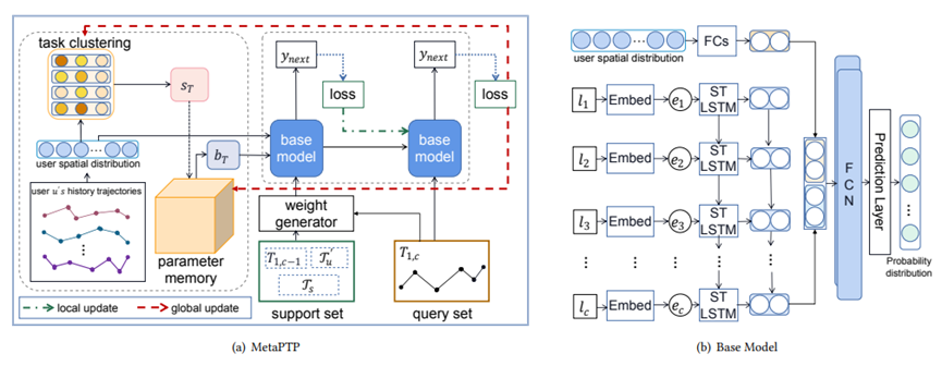 ,以实现在具有相似旅行偏好的用户之间共享知识以及在初始化步骤中提供个性化的网络参数。从MP中读取网络参数bT:bT = (sT)T ⋅MP,bT是个性化偏差项。因此,轨迹可以在广义的基础上学习每个集群中的共享知识,得到个性化的预测层参数θpre:θpre =
