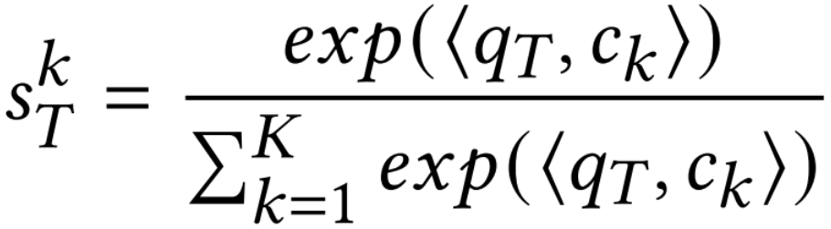 ,其中 <qk, ck>是查询向量qT和聚类中心的余弦相似度,K是聚类的数量。值得注意的是,所有集群的聚类中心在训练前是随机初始化,并在训练期间不断更新。