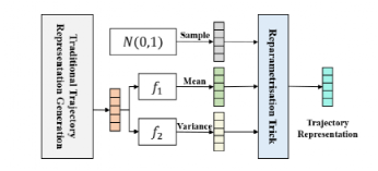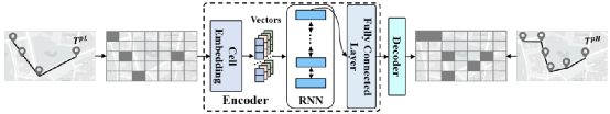 地图匹配是一个基础研究课题,其目标是将 GPS 轨迹与道路网络上的路径对齐。然而,受恶劣环境的影响,原始 GPS 轨迹数据往往存在三个关键问题,即噪声、低频和不均匀性,导致定位不精确和不确定。现有地图匹配模型无法从低质量(即噪声、低频和不均匀)轨迹数据取得令人满意的性能。本文带来了由重庆大学陈超老师团队发表在国际顶级数据挖掘领域期刊TKDD 2022上的论文:《L2MM: Learning to Map Matching with Deep Models for Low-Quality GPS Trajectory Data》随着GPS等位置获取技术的普及和应用,海量的GPS轨迹数据被采集并广泛应用于各个领域。原始 GPS 轨迹数据往往存在三个关键问题,即噪声、低频和不均匀性。例如,城市环境中的高层建筑遮挡了多颗 GPS 卫星,导致 GPS 定位误差;有限的能量和传输带宽限制了 GPS 位置只能以低频进行采样;不同的 GPS 设备设置和不可预知的通信故障可能会产生不均匀的采样时间间隔。因此,提出了地图匹配来解决将原始GPS轨迹捕捉到道路网络以识别运动物体的真实运动路径和真实位置的问题。地图匹配的任务对于许多应用程序具有重要意义。例如导航、行程时间估计、路线优化等。然而,对于低质量的轨迹,地图匹配模型很难达到令人满意的性能。在本文中我们设计了一个通用的、鲁棒的基于深度学习的模型来解决低质量GPS轨迹的地图匹配问题。它对低采样率、非均匀采样率和噪声具有更强的鲁棒性。而且,即使使用少量的训练数据,它也能达到相当好的性能。此外我们开发了一种模式识别方法,基于学习到的表示来探索隐藏在历史轨迹中的模式,并通过使用联合优化方案将它们明确地纳入到地图匹配中。值得注意的是,这是首次尝试将模式识别作为地图匹配任务的重要组成部分,以提高所提模型的泛化能力。地图匹配问题的一般目标是识别基于段的轨迹,因此我们需要将GPS的原始轨迹集{TP},通过一个映射函数f映射到段的轨迹集{TS}中,即实现f(TP)->TS的过程,在此过程中我们需要克服噪声、低频、和不均匀以及一些主观因素等诸多因素。最后将空间向量解码回路网上的具体地点实现规划过程。如图所示,本方法主要由四个部分组成:1)轨迹表示学习与增强,这部分主要利用了高质量轨迹增强和利用数据分布增强、2)模式识别与表示,这个部分我们挖掘轨迹中隐藏的模式,并将其进一步引入到地图匹配之中、3)轨迹匹配与生成,这个部分中我们主要对轨迹向量进行解码,并且将解码后的向量映射到地理空间、4)联合优化,最后这个部分主要共同优化前面所提到的三个组分。L2MM 有两个工作阶段,包括离线训练和在线推理。在离线训练阶段,这四个组件协同工作,训练深度学习模型进行地图匹配。离线训练阶段的流程,可以参考图1中带箭头的实线。而在在线推理阶段,使用现成的深度模型,只有轨迹表示学习和增强、轨迹匹配和生成两个组件参与工作并返回基于给定测试点的映射结果轨迹。可以将高频或低频的基于点的轨迹连续输入L2MM以进行驾驶路线推断。在线推理阶段的过程如图 1 中带箭头的虚线所示。轨迹表示学习是将物理空间中的原始轨迹转换为潜在空间中的表示向量,对于低质量的基于点的轨迹来说,包含的真实驾驶路径的信息很少,导致语义表示模棱两可,而且有限的轨迹数据削弱了表示的泛化能力,所以提出了高频轨迹的增强以及增强数据分布。高频轨迹的增强。高频轨迹包含了车辆运动的更多细节,这可以很好地去弥补低频轨迹的信息有限的缺点。所以我们结合高频轨迹的信息来增强低频轨迹的潜在表示。我们选用seq2seq模型自动学习高质量的轨迹表示。在我们的模型中将低频轨迹作为输入序列,相应的高频轨迹作为目标序列,如下图所示,它主要由编码器和解码器两个模块组成,前者可以将可变长度的输入序列映射到一个固定维的上下文向量一个单元嵌入层、一个循环神经网络 (RNN) 层和一个全连接层实现。我们使用𝒉𝑖 = GRU (𝒉𝑖−1, 𝑔𝑖)来更新隐藏状态。为了增强特征提取能力,我们特意采用了双向GRU作为基本单元,从前后两个方向捕捉其中复杂信息。后者从高维空间的上下文向量来生成恢复的轨迹。由RNN 层、全连接层和 softmax 层三层组成。我们利用配对的高频基于点的轨迹𝑇𝑝𝐻导出的相应的基于网格的轨迹来减少恢复的轨迹 𝑇𝑔𝐻′ 和预期轨迹𝑇𝑔𝐻之间的损失。通过这种方式,可以学习到高频轨迹的丰富细节并将其纳入上下文向量,从而增强其表达能力。增强数据分布。学习从轨迹到相应路径的映射是由大量的训练数据驱动的。然而,由于采样成本和存储限制,训练数据有限甚至不足。训练数据的有限大小严重降低了基于学习的模型的性能。在这里,我们通过利用潜在空间中表示向量的分布来增强轨迹表示。通过 seq2seq 模型进行预处理后,低频轨迹被编码为固定维度的上下文向量。它们是分散在高维潜在空间中的点。一旦解码和重建,每个点都可以对应于基于分段的轨迹。由于训练轨迹的大小有限,它们稀疏地分布在潜在空间中,在提供关于通往看不见轨迹的真实驾驶路径的有效线索方面表现不佳。直觉上,这些点的分布应该有一定的规律性。首先,相似的轨迹输入应该被编码为相邻点。其次,解码到相同基于分段的轨迹的点应该在潜在空间中尽可能接近。我们通过添加正则项来规范潜在空