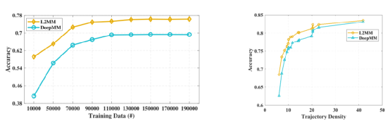 首先我们在不同的数据集上比较L2MM、HMM[2]和DeepMM[1]。三种方法的总体性能如图所示:如图6所示,与 HMM 和 DeepMM 相比,当采样时间间隔超过 60 秒时,L2MM 总体上实现了最佳性能。HMM 的性能急剧下降,而我们的方法性能要好得多,尤其是当采样时间间隔大于 90 秒时。原因是两个连续 GPS 点之间的距离在低频下(例如,采样时间间隔为 135 秒)可能为数公里,导致 HMM 在寻找真实行车路径时存在很大的不确定性。在深度学习模型的帮助下,DeepMM 可以将稀疏的轨迹映射到驾驶路径。当采样时间间隔增加时,所有三个模型的准确度都会下降。尽管如此,与其他两种模型相比,L2MM 的变化要小得多。具体来说,当采样时间间隔从 30s 增加到 135s 时,L2MM 的准确率仅下降了 7%,而 HMM 和 DeepMM 的准确率分别下降了 24% 和 7.6%。该结果验证了 L2MM 对频率降低的表现更加稳健。模型在Porto数据集上的匹配精度优于重庆数据集。这可能是由于不同的噪声水平对两个数据集的影响。如前所述,重庆数据集中的轨迹由粗略的位置估计组成,平均定位误差为 26.7 米。特别是在30s的采样时间间隔下,L2MM和DeepMM的准确率分别降低了6.5%和7.5%,而HMM的准确率降低了10.8%。而且L2MM模型对训练数据的大小更加稳健,在精度方面页具有更强的鲁棒性。如图7所示图7 不同训练数据量下的准确性,不同轨迹密度精度图为了进一步探索L2MM在复杂情况下处理映射匹配的能力,我们以重庆为例,使用两个代表性案例来直观地展示它如何优于基线方法,包括HMM和DeepMM。需要注意的是,路网用黑线表示,原始轨迹用一系列GPS点用蓝色表示,三种地图匹配算法的匹配结果用不同的颜色表示。可以看出我们学习了基于相应高频轨迹的L2MM的高质量轨迹表示。它有助于在这种复杂的情况下找到正确的行驶路径。本文提出了一种基于深度学习的地图匹配模型L2MM,旨在高效地映射低质量的轨迹数据。解决此类低质量GPS轨迹的地图匹配问题对许多应用具有直接而深远的意义。此外,L2MM显式识别潜在空间中的典型移动模式,以探索更一般的启发式提示,并巧妙地将识别的模式合并到地图匹配任务中,以便利用这些提示来促进地图匹配。我们基于一系列数据集进行了大量实验,结果不仅证明了L2MM在精度和效率方面的优势,而且验证了高质量轨迹表示和移动模式的重要性。参考文献