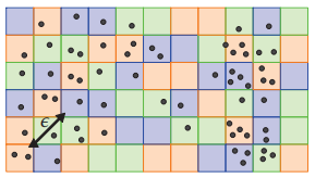 为了解决这些问题,本文提出了一种新的并行DBSCAN算法,随机分区DBSCAN,简称RP-DBSCAN,它使用伪随机划分和两级单元格字典。伪随机划分是一种基于单元格的数据划分方案,它可以随机采样小的单元格,而不是点本身。无论数据如何分布,它都可以实现负载平衡,同时保持DBSCAN所需的数据连续性。两级单元格字典是整个数据集的一个高度凝炼的摘要,来表示每个随机分区。该算法能够实现同时找到每个数据分区的局部聚类,然后将这些局部聚类合并得到全局聚类。论文:Song H, Lee J G. RP-DBSCAN: A superfast parallel DBSCAN algorithm based on random partitioning[C]//Proceedings of the 2018 International Conference on Management of Data (SIGMOD). 2018: 1173-1187.本文定义 d 维空间中的一个单元格是一个对角线长度为 ε 的 d 维超立方体, ε 是一个表示邻域半径的参数。如果至少有一个数据点位于一个密集区域内,则可以保证该单元格中的所有数据点都属于同一簇。这大大简化了之后的聚类合并过程。在进行数据分区时,我们随机采样单元格,而不是采样数据点,因此称为伪随机划分。然后,将相同颜色的单元格及其内部的数据点划分为同一个分区。由于 ε 远小于整个空间的长度,这种划分也可以实现真正的随机划分的效果。图 1 说明了伪随机分区的思想,不同颜色代表不同分区。