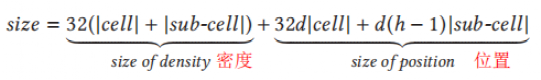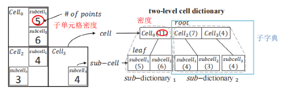 两级单元格字典是整个数据集的一个摘要。本质上它是一个两级的树。第一级的节点对应单元格,第二级的节点对应子单元格,其边长为单元格的 h 分之一,其中h由用户给出以指定近似度。每个节点编码每个(子)单元格的密度及其位置。密度是其内部的点数,而位置可以用它们所属单元内的子单元的顺序来表示,故只用 d (h − 1)位。(d 是维度, h 是字典级数)如图 2,h = 2,d = 2,只需两位来表示子单元格位置(00,01,10,11)。
