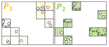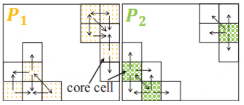 通过伪随机划分对整个数据集进行分区,并构建两级单元格字典,为并行处理做好准备。向并行系统中的每个工作者发送一个分区和对应的两级单元格字典。如图3,整个空间被划分为诸多单元格,其中没有为空区域创建单元格。将黄色和绿色单元格划分到两个不同的分区 P1 和 P2 中。然后为每个分区生成一个两级单元格字典。
