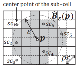 如图5所示,若点p与子单元格中心scn的距离小于ε ,那么,就将这个子单元格加入到点p的邻居集合当中。当点p的邻居点数大于等于设定的参数minPts,就把包含p的单元格标记为核心单元格。