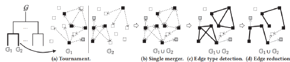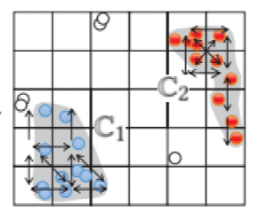 这一部分主要包括渐进式图合并和点标记两个过程。首先,结合从每个工作者返回的对应每个分区的单元格图,确认每条边直接可达性关系,以合并成全局单元格图。之后,根据合并后的图对聚类进行扩展,并根据最终的聚类结果来标记所有的点。整个过程就是由局部聚类产生全局聚类。例如在图 6 中,单元格图简单合并后要进行边类型检测,即判断是完全边(深色实线),部分边(实线箭头)还是未知边(虚线箭头),还要进行减边操作,根据树的结构去除冗余边,最终得到一个树式的全局单元格图。然后,图 7 中进行点标记,图4中位于 P1 和 P2 左下角的单元格在图 7 中形成了一个C1簇,将单元格其中的点标记为同一个颜色,即为最终聚类的结果。