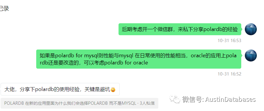 如果敢兴趣可以加 liuaustin3 微信,加到polardb 的知识分享群和文章问题询问群,如果可能还会拉上polardb的厂商的一些工作者,(争取,需要征得人家的同意) 来更好的学习POLARDB for MYSQL 。 同时最近问问题的人也比较多,此群也可以提出对文章中的问题使用。