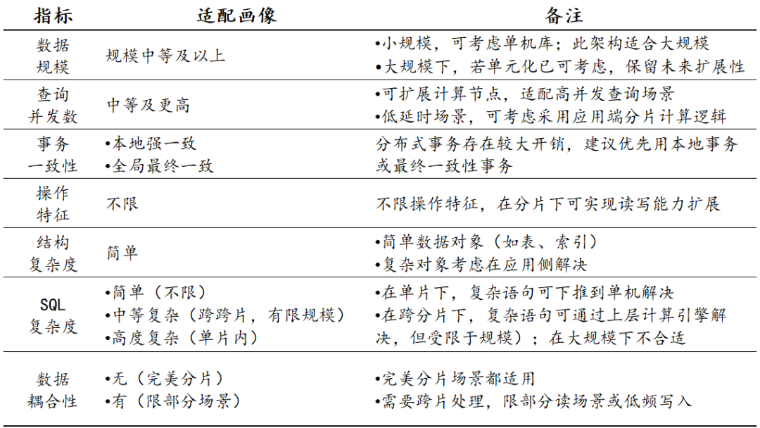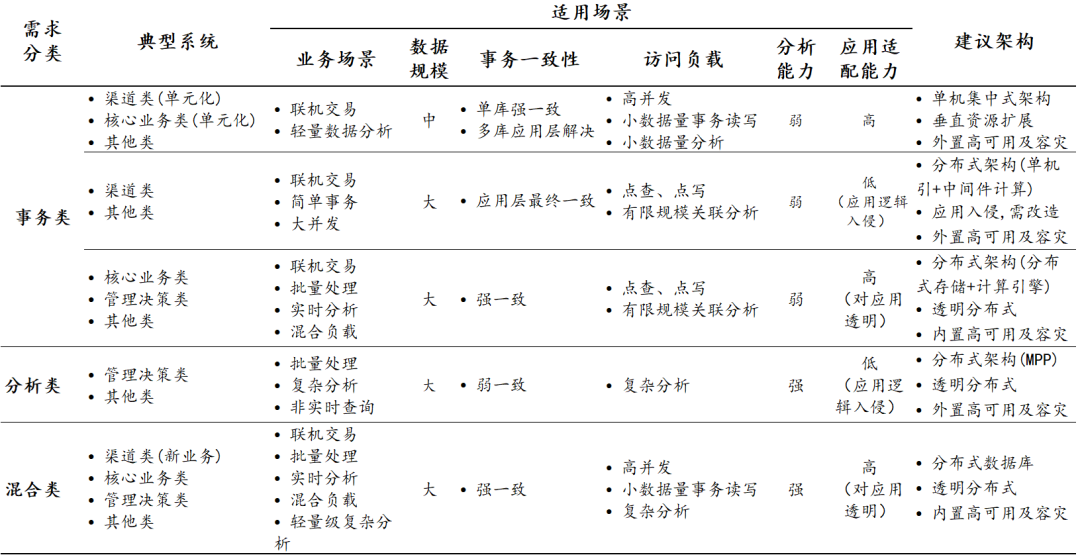根据上述不同要求,根据业务场景从技术角度进行分类。可按照如下维度进行区分。其中重点从数据规模、事务一致性、负载特征、数据分析能力、应用适配能力等角度进行对比,并给出建议架构。