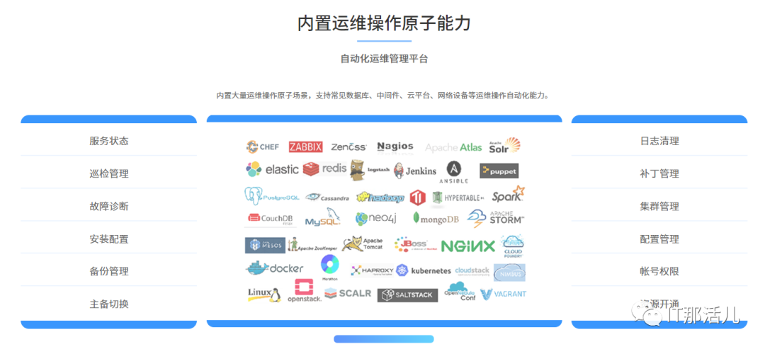 内置大量运维操作原子场景,支持常见数据库、中间件、云平台、网络设备等运维操作自动化能力; 支撑八大运维场景自动化; 灵活的可视化任务编排及调度,操作、资源、工具、人员的任意编排调度,构建多方位自动化能力。