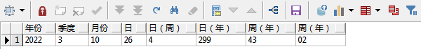 SELECTTO_CHAR(SYSDATE , 'yyyy') AS 年份 ,-- 年份TO_CHAR(to_date('2022-07-01', 'yyyy-mm-dd'), 'q') AS 季度 ,-- 季度TO_CHAR(SYSDATE , 'mm') AS 月份 ,-- 月份TO_CHAR(SYSDATE , 'dd') AS 日, -- 每月的第几天TO_CHAR(SYSDATE , 'd') AS "日(周)", -- 每周第几天(第一天是周日)TO_CHAR(SYSDATE , 'ddd') AS "日(年)" , -- 每年的第几天TO_CHAR(SYSDATE , 'ww') AS "周(年)", -- 每年的第几周TO_CHAR(to_date('2022-01-08', 'yyyy-mm-dd') , 'ww') AS "周(年)" -- 每年的第几周FROMdual ;