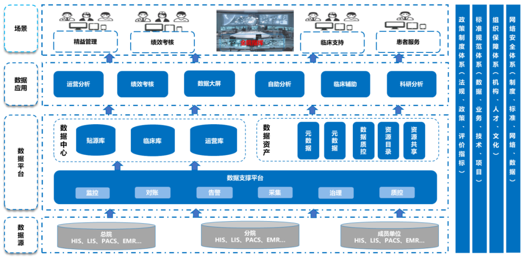 宁波市第一医院的智慧运营分析平台整体架构设计为“四横四纵”八大体系,其中“四横”为数据源、数据平台、数据应用、应用场景,“四纵”为政策制度体系、标准规范体系、组织保障体系、网络安全体系,总体实现纵向贯通、横向协同。如图1所示。